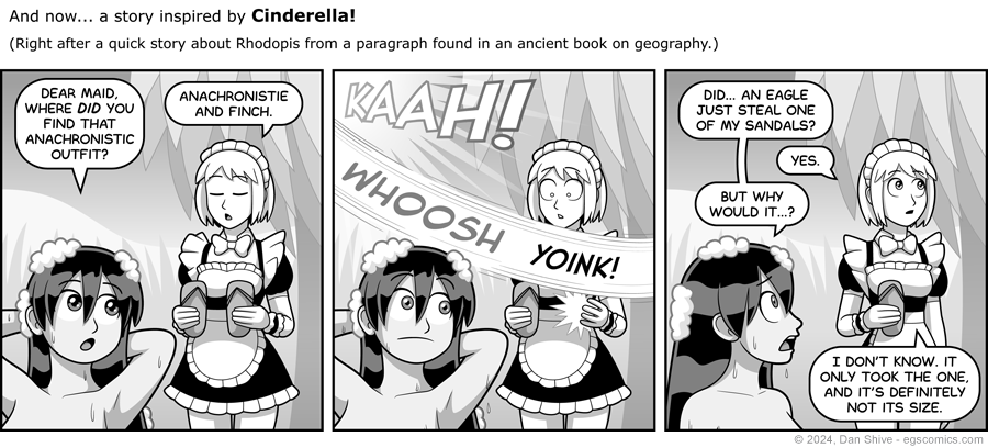 While looking up information on Rhodopis, I encountered more recent stories inspired by it that were made to be even more Cinderella-like. I don't recall them making clear that was the case, which made confirming information about Rhodopis EXTRA fun! Ha ha haaaa...