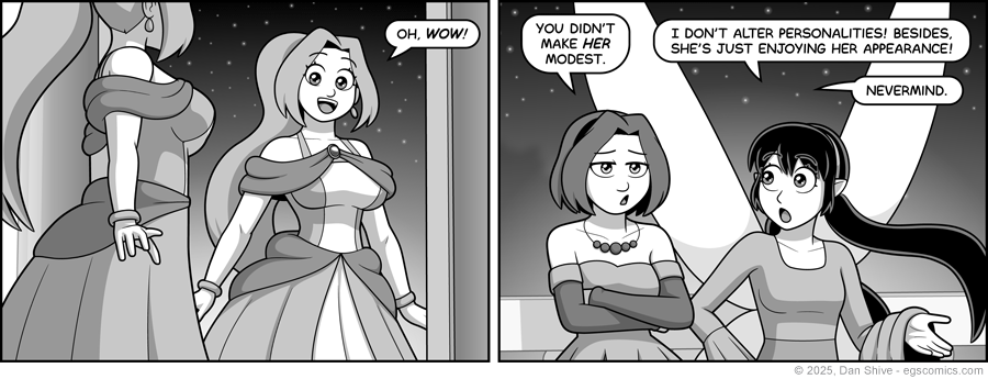 I didn't want to fill up the first panel with the explanation of a conjured mirror, nor did I want to force that explanation into the second panel, so I hope everyone jumps to the conclusion that the mirror that's suddenly on the balcony is, in fact, the result of convenient fairy godmother nonsense.