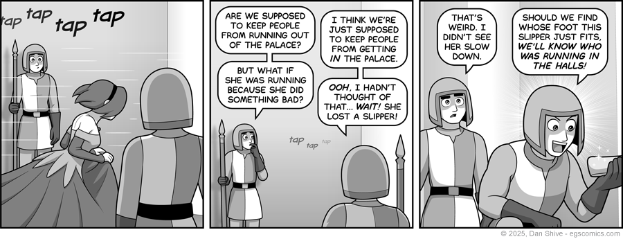 I was tempted to completely hide the eyes of the guards in shadow. Thanks to the helmets, it felt like it would have worked as an homage to various cartoons and video games that kept the faces of generic guards hidden in shadow. Given that my only reason to do it was an homage that would've confused most people, however, I decided against it.