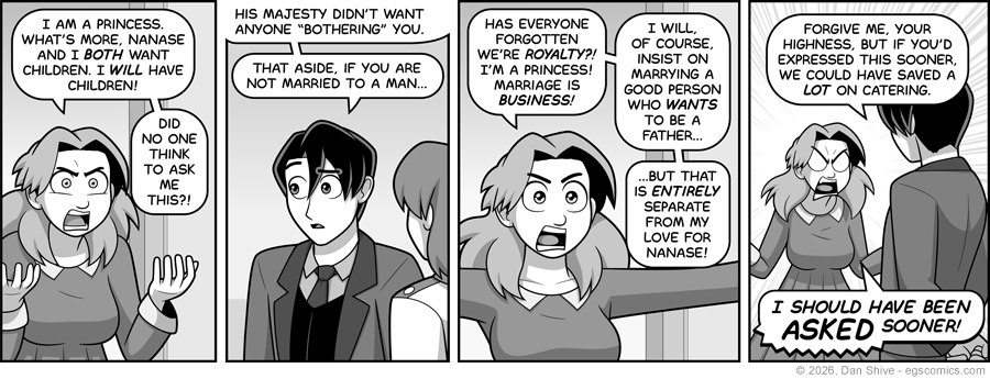At one point, panel two began with “his majesty didn’t want anyone discussing it,” but that wasn’t the vibe I wanted. I wanted less implication of coverup, and more “NO UPSETTING HER.”