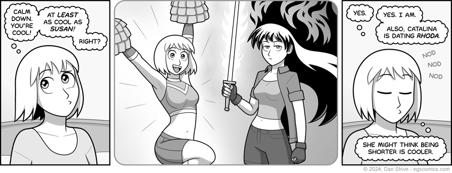 I originally imagined Diane being less confident in panel three, and trying to cheer herself up with the above backflip argument.