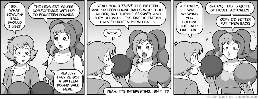 I wanted to have some sort of conversation involving bowling balls that resulted in a show of strength by Lucy, and was still figuring that out when I was looking up weights for bowling balls. That was when I stumbled onto the discussion of "which ball weight is the best", some physics equations, and anecdotes supporting the conclusion.