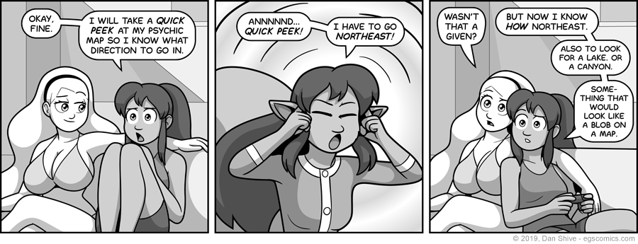 As some pointed out after the last comic, an issue with turning off the compass, quest markers, etc in modern games is that the quests are designed with those existing in mind. NPCs aren't going to give you clues where to go or directions most of the time. More often, they're just going to say "go to THIS location", and then you have a quest marker.