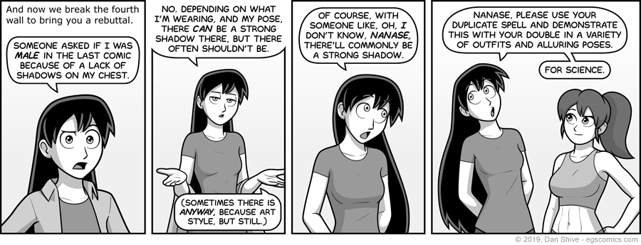 As for the whole shadow thing, I'm trying to get better at drawing that whole, um, area, though sometimes it just looks better if I put a shadow there even if its presence is questionable.