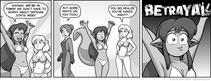 Most NPCs (Non-Player Characters) have huge double standards when it comes to NPC versus Player character lack of wearing equipment. No NPCs in games I know of react to other NPCs not wearing anything, but if you do it, there can be all sorts of critical dialogue, and the irony in panel two is no exaggeration.