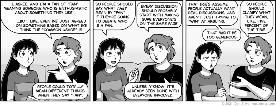 I've witnessed way too many arguments that went nowhere because they didn't do this, up to and including arguments in which they actually AGREED with each other, but they just kept going because everything was poorly defined and not clarified.