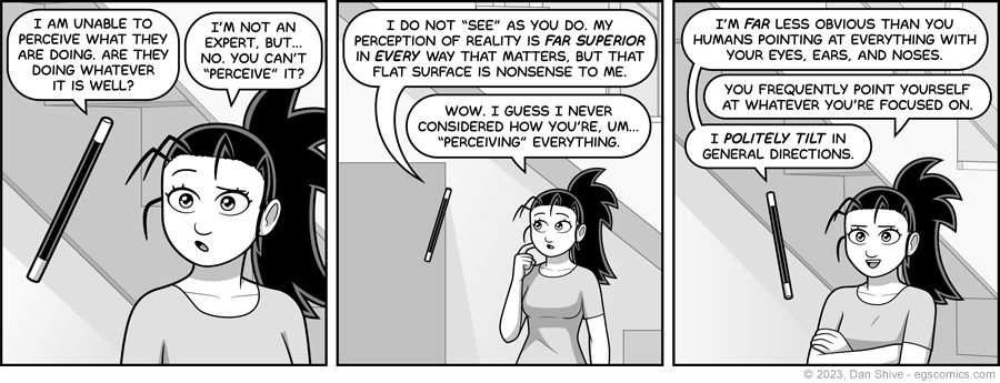 I don't want to commit to how exactly Kevin perceives reality. For all I know, future me will have a story relevant idea for how he's doing it, and I'd rather not contradict him. He's likely older and grumpier than current me.