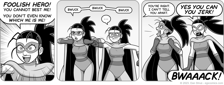 Which I almost decided against this time. I wrote this comic before I'd settled on visuals for the previous exposition-filled comic, which wound up having its own silly visuals.