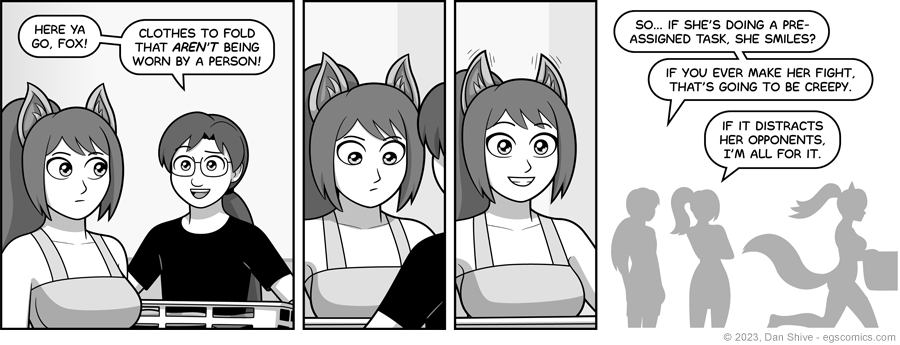 As for Fox's expressions when she HASN'T been given something specific to do while being summoned, those generally reflect Nanase's present feelings, or are similar to faces Nanase herself would naturally make were she in Fox's place.