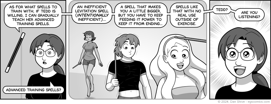 Authorial intent was for panel two to be Tedd's imagination, hence Grace, Elliot, and Sarah. Helping those three train their magic is totally where Tedd's mind would go here (in addition to "yay new spells to play with").