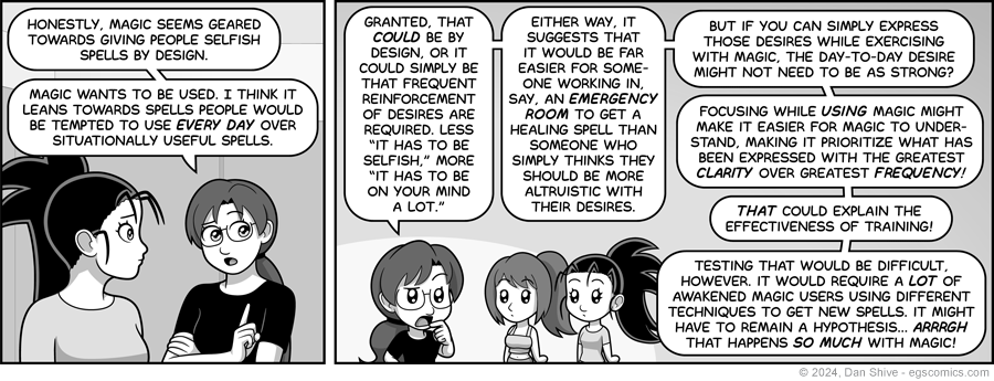 I didn't set out to write a "Tedd is rambling" comic. The "magic seems geared towards selfish spells" was simply a point I couldn't fit in the previous comic, and panel two is close to what naturally followed.