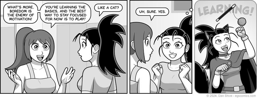 "You have the top two-thirds of one panel to set up catgirl Ashley batting at a fluffy ball."