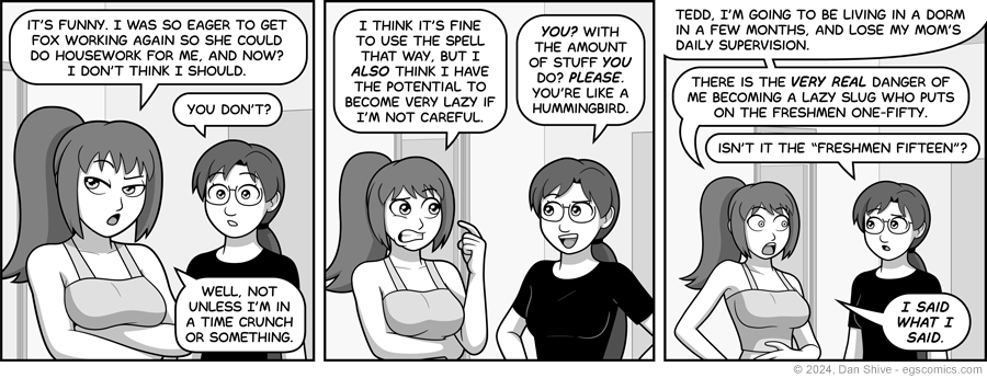 I have NO idea if it's remained commonly joked about thing, or what all countries it's joked about in (is it the freshmen 15 kg, or 33 lbs., in Europe?). Either way, here it is in a comic I have made in 2024.