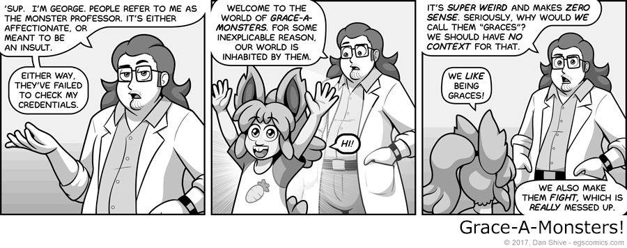 Normally, I put a storyline title ABOVE the strip itself in EGS:NP, but I felt like the first mention of the title should be in panel two, so obvious solution was obvious. In case anyone thought it weird to have "Grace-A-Monsters!" down there, however, there's an explanation for ya.