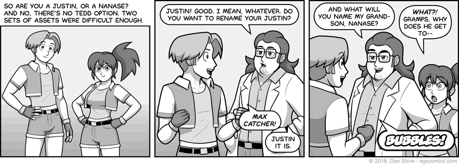 The assets comment in panel one references how there's multiple hair, clothing, etc options for each version of the player character, and how much work adding a third, gender neutral option would be. One can still hope, however and darn it.