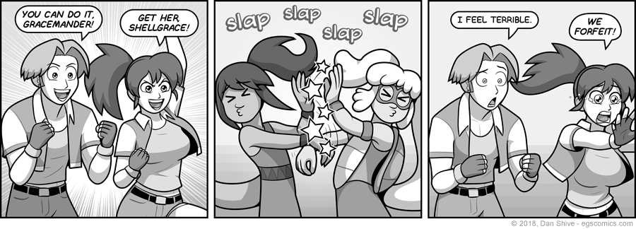 Panel two is a pretty accurate representation of the first fights in early Pokemon games, really. As of the XY and Sun/Moon games, your starter monster has an elemental attack to begin with (and your poor first opponent will be weak to your element). Back in the day, however, you just had tackle and the like, meaning no elemental advantage either way. It was just a back and forth of rather pathetic attacks.