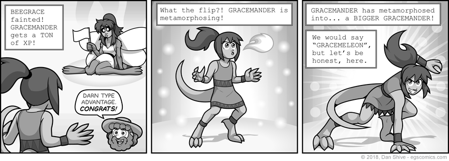 Gracemeleon is closer to human Grace than Gracemander (well, closer to ADULT human Grace). While it's not apparent in that rad pose, however, Gracemeleon is significantly shorter than human Grace, and is a bit less bulky all around.
