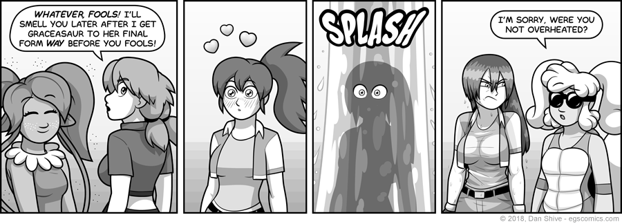The inspiration for this was "needing a cold shower", but of course lovely and innocent ShellGrace wouldn't be thinking like that, would she? Concern about her trainer being too hot on a summer day, however, is another matter.