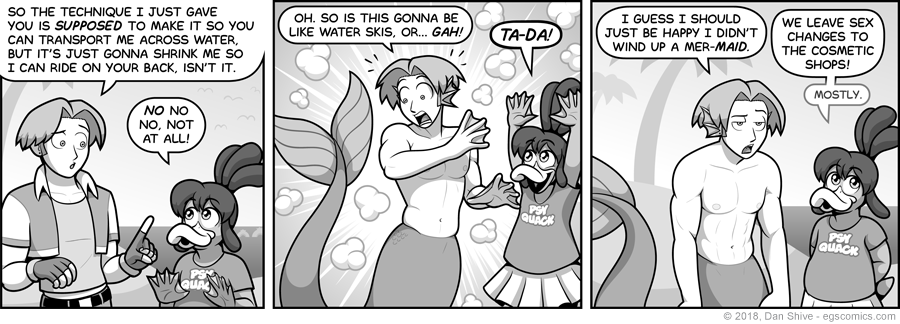 I believe feminine forms have the advantage, visually, on the mer-front. A mer-tail easily includes a hip shape that complements a feminine figure, whereas a mer-tail doesn't really complement more rectangular masculine hips. One's posterior is also a casualty of having a mer-tail, which is a loss made less severe by feminine mer-hips.
