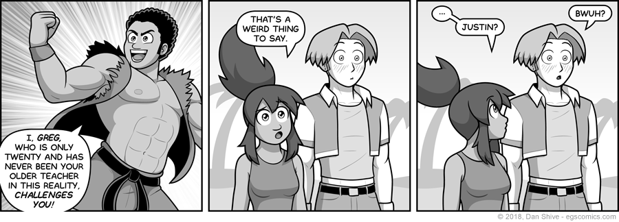 But wait, is that weird? I haven't established Greg's age, but it's gotta be at least late twenties, and he was Justin's teacher! Sure, it wouldn't be at all strange for Justin to think Greg is attractive, but it could still be awkward given that context.