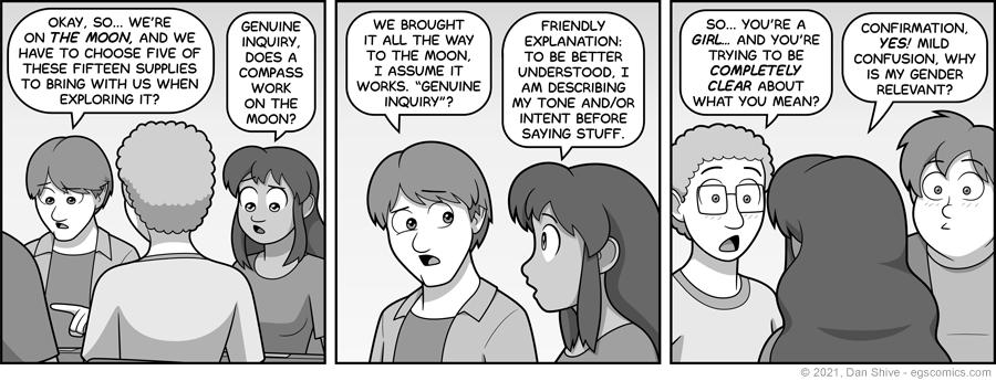 The group assignment is based on an actual group assignment I had in high school. I don't remember all the specifics, but I do remember the idea being somewhere other than Earth, and one of the items being compass (I'm not 100% certain the actual scenario was on the moon).