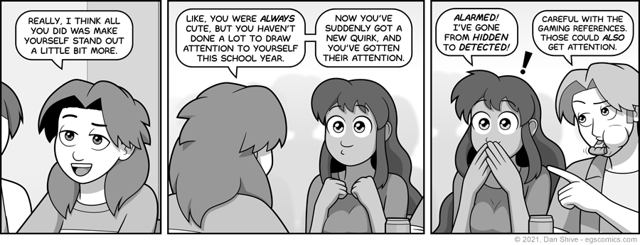 I wind up breaking the 180 degree rule in this scene as a result of me excitedly making the backgrounds in advance (basically, Ellen and Grace shouldn't be facing the same direction). Granted, I could probably flip the sea of blurry silhouettes that people might not have even noticed were silhouettes (and took me a weirdly long time to make) without anyone noticing, but I feel committed to this now.