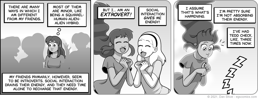 AND! And and and! I'm not saying extroverts just increase in power while hanging out and never get tired! That's ridiculous.