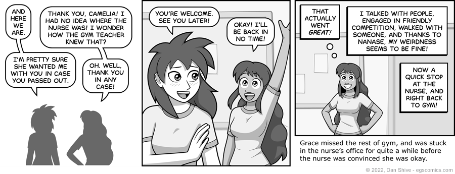 I had trouble writing this comic, and that was in large part because I was trying to write more than it needed to be. Beyond establishing the Theory of Nanase Relativity, the point of them walking together was a friendly interaction that Grace was happy with, and Camelia clearly having developed some fondness for Grace.