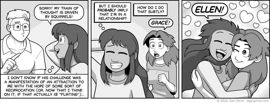 In any case, if discussions after the previous comic have taught me anything, flirting can mean literally anything depending on who you ask, and people are terrible at determining whether other people are flirting regardless of the definition used. It's probably best not to assume unless you really know someone well.
