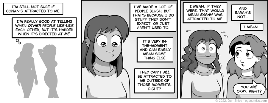 What I'd originally intended was simply Grace thinking about how she could tell when people like-liked each other, but was less sure about people being like-liking her, and I'd planned for her to note it wasn't exactly a challenge to tell when some people liked each other (cue reference to Justin in regard to Conan).