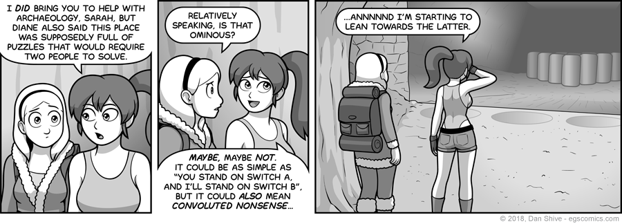 Granted, I'm using the term "puzzle" loosely, here. Arguably. By video game standards, pushing the right block along a path until it falls into a hole is considered a puzzle, and I consider the puzzles I've come up with to at least have that beat.