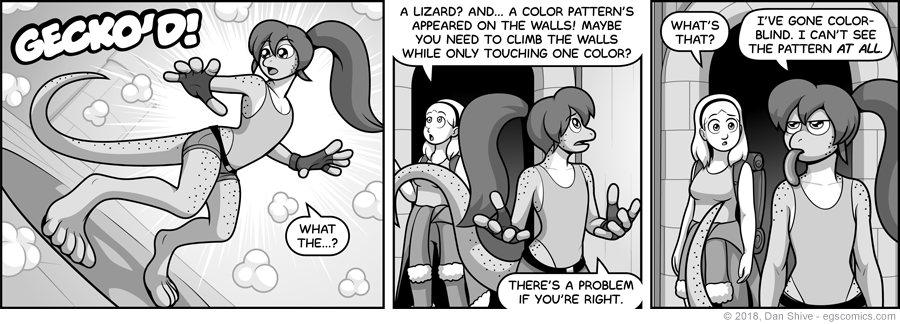 EDIT: The color blindness is something I came up with for the puzzle, and not anything to do with her being a gecko.