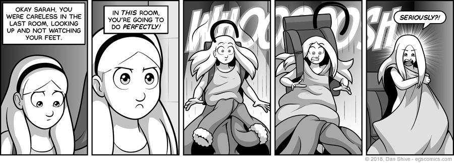 The second is that I am deliberately not showing Nanase in this strip, leaving what has or hasn't happened to her a mystery until the next comic. This alone made zooming out to show Sarah shrinking in a single panel work impossible, but it also made her shrinking in just two panels not work. I needed the panels narrow and tall for all of the reasons I've mentioned, which called for a third step.
