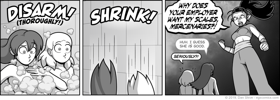 In addition to amusing me, I wanted the overly descriptive sound effect in panel one to make very clear what Fairy Ashley's intent was. It might seem like it would have been difficult for Nanase to be concealing a weapon, but Ashley's probably seen Die Hard, and Sarah could have been, so it's not entirely unreasonable.