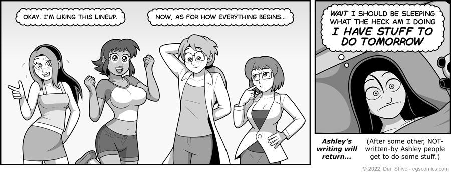 I really do want to do a storyline that is a story written by Ashley. This storyline will include both the quirks of the characters she's created, and the quirk that all the dialogue and such will be written by her.