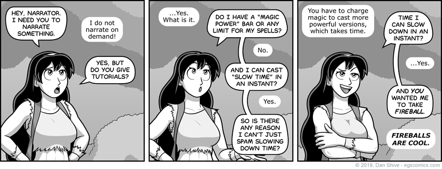 I talked about this in an earlier commentary, but my policy is always that these commentaries are optional reads, and this "magic at no real cost" dealie and the ability to just use magic over and over indefinitely is something I want everyone on the same page on.