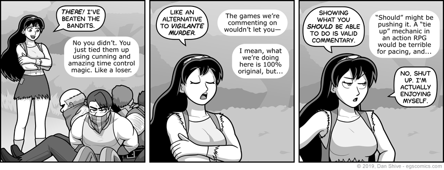I chose to draw this storyline in my standard drawing style with normal proportions, and found I didn't like the idea of Susan running around and killing bandits without the extra layer of absurdity added by more cartoonish proportions.