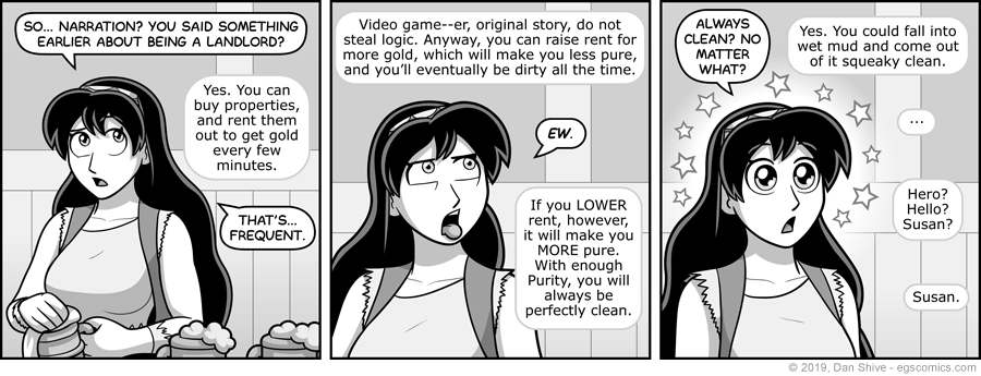 And thus was one of the reasons I chose Susan for this parody adventure. Beyond just the general fun to be had with Susan in a setting like this, the idea of literal cleanliness being linked to one's moral purity was reason enough on its own for Susan to take the controller.