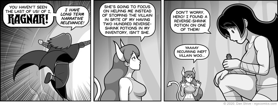 For parody purposes, there's really no need for Ragnar to come back. He's done his job. Part of my quest in this parody is to comment by showing alternatives for, rather than just exaggerations and weird twists on, the source material. Therefore Rhoda, the hero of melee weaponry that smashes and stabs and such, gets a personal adversary of sorts who'll be back later.