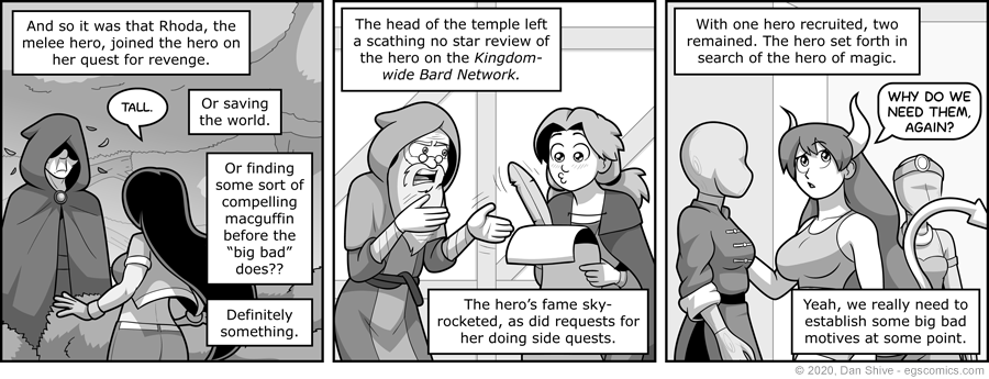 Panel two is partially inspired by The Witcher (books in particular), and people knowing about the main character Geralt by virtue of bard-sung word-of-mouth.