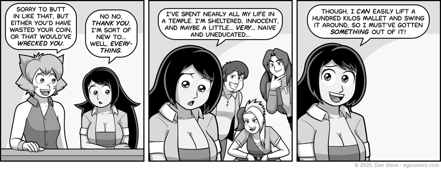 Rich and "Bad" Tom are potentially recognizable, but the woman in the background of panel two isn't based on anyone in particular. I wanted one of the people getting ideas to be a woman, but I haven't yet introduced anyone in canon I would want to put in that role, so I just drew someone with wildly asymmetrical hair for fun (as one does).
