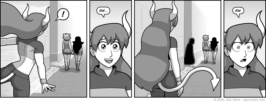 Because of my aversion to drawing close ups of hand holding, we got Rhoda and Catalina kissing, and then a second comic devoted to them actually holding hands, because I had THIS comic in mind before the comic they kissed in, and I wanted hand holding while walking witnessed from a distance.