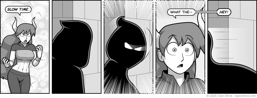 I didn't feel like drawing a proper background in panel one, so we wound up with... Whatever THAT is.