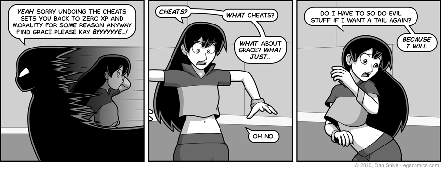 After the last strip, it was pointed out to me that Susan's shirt really shouldn't be that loose at the bottom. After doing several complex calculations, and consulting someone wearing a lab coat, I have to concede the point. It should be looser than before, but not THAT loose.