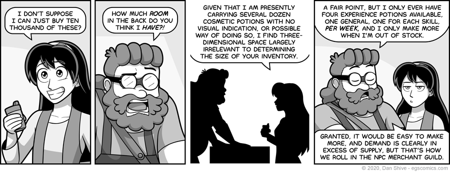 I hadn't actually planned on addressing this, but after being asked "why doesn't Susan just buy a bunch of the less potent potions" by several people, it became apparent that people had clearly FORGOTTEN how shops in the games I'm parodying work, and how they'd restock only after waiting seven days in-game time, and sometimes you'd have to wait a bit longer than that, or travel elsewhere first, or do SOMETHING to get the restock to trigger, because video games are weird sometimes!