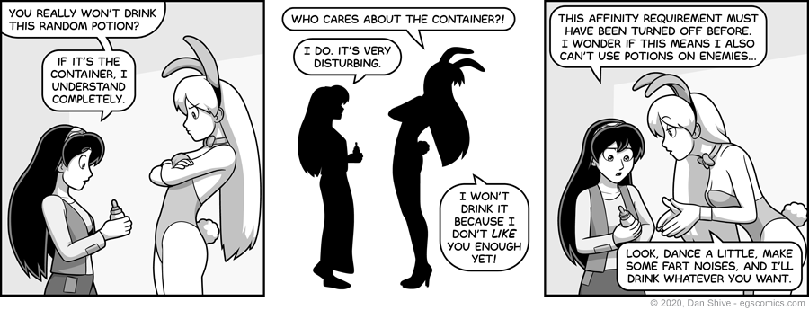 This was what I originally had planned for the previous comic before realizing I really needed to address "why not just buy more potions" question.