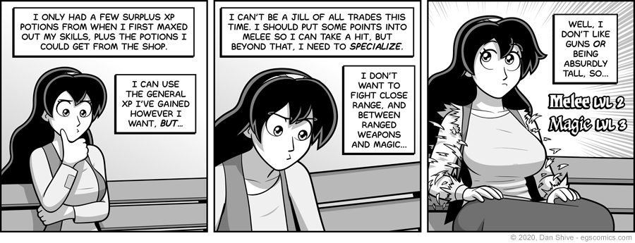 I was originally going to have Susan drinking more potions in the comic itself, but then it occurred to me that the whole idea here is she's deciding how to distribute generic XP boosts, which would happen after potions were consumed, so... Yeah, that didn't work, exactly.