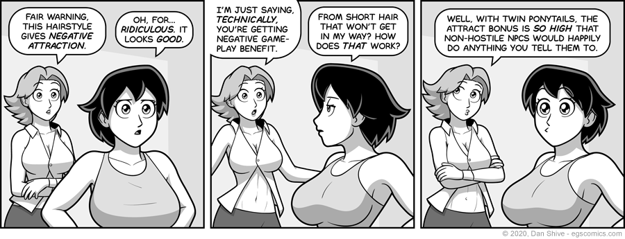 Thing is, recently, there have been times in this storyline when I've wanted to show Susan's back, and I've found myself drawing her hair doing all sorts of nonsense to get out of the way. It's one reason I've considered this option.