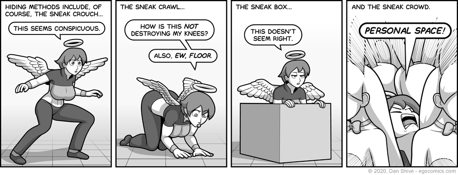 Panel three references the Metal Gear Solid games, in which main character Snake hides, and feels quite safe, under large boxes. One might assume a box changing positions would be a dead giveaway, but as I've gone on about, change blindness is a thing. If someone doesn't see the box move, it might not register in their minds at all.