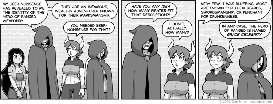 Susan't reaction in panel one was pretty much my own until I stopped and thought about it. Even knowing of an infamous marksman adventurer, there'd be no guarantee that they're THE "ranged hero", and seer-nonsense would be as good a way to know for sure as any.